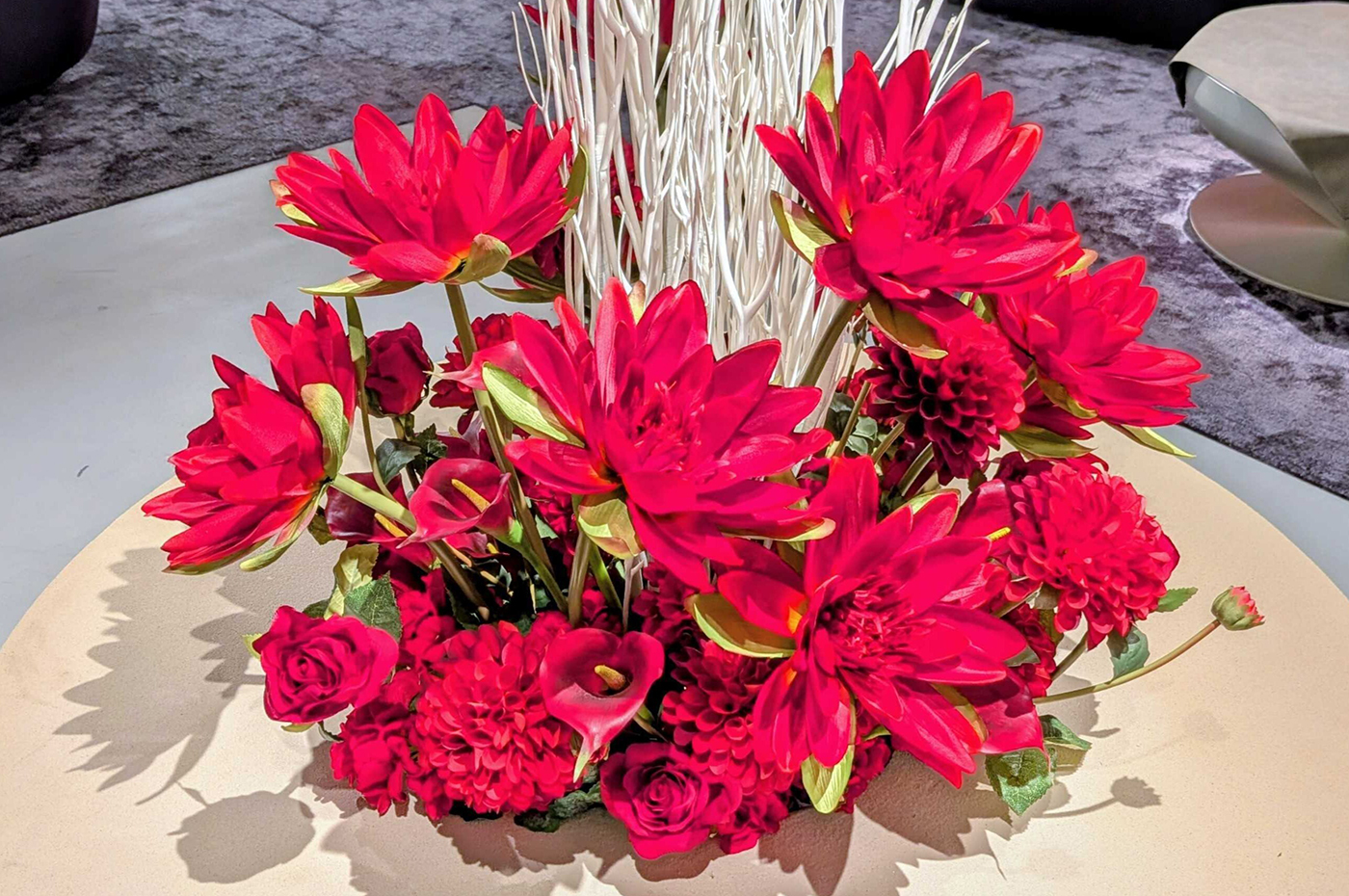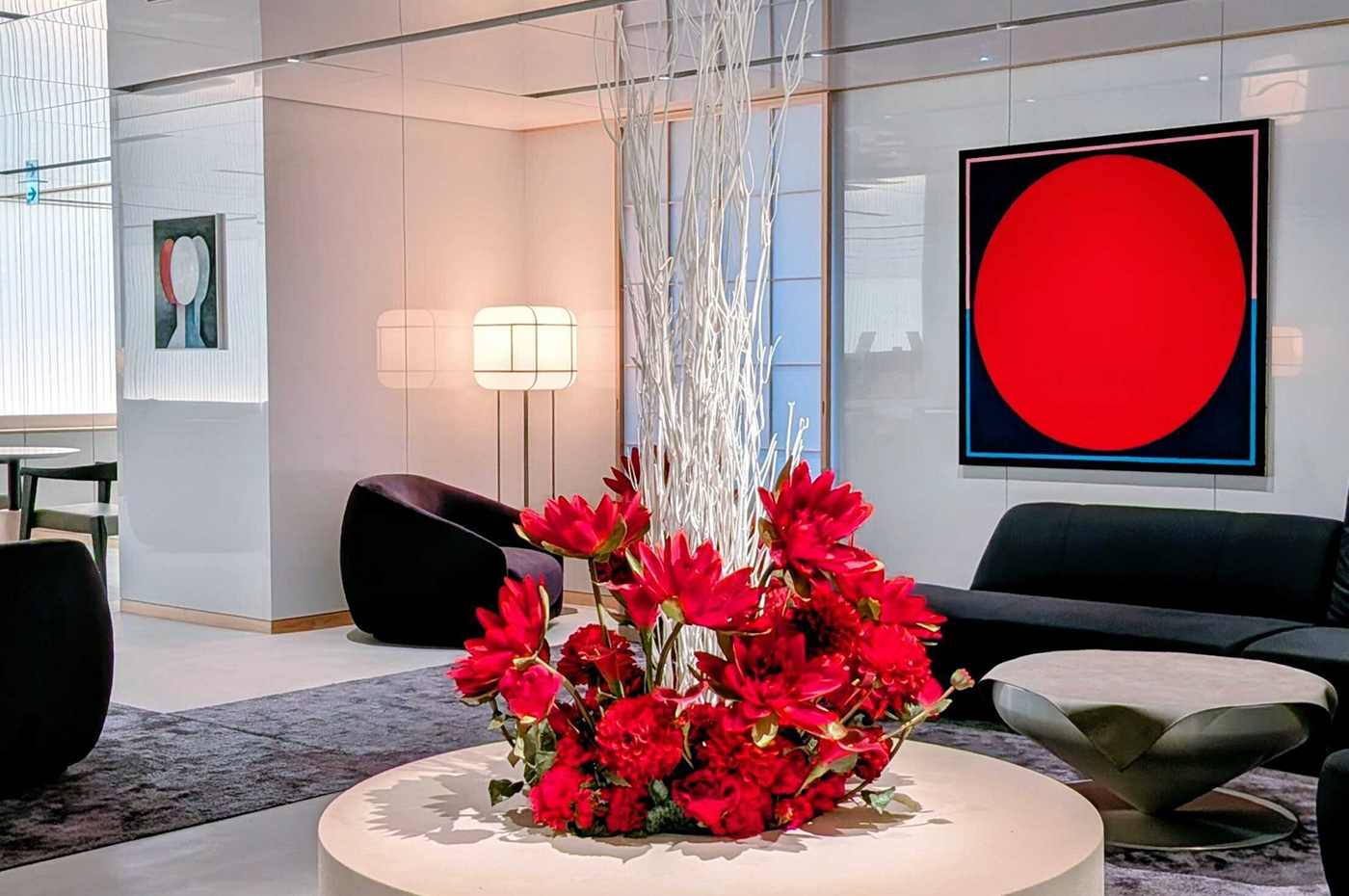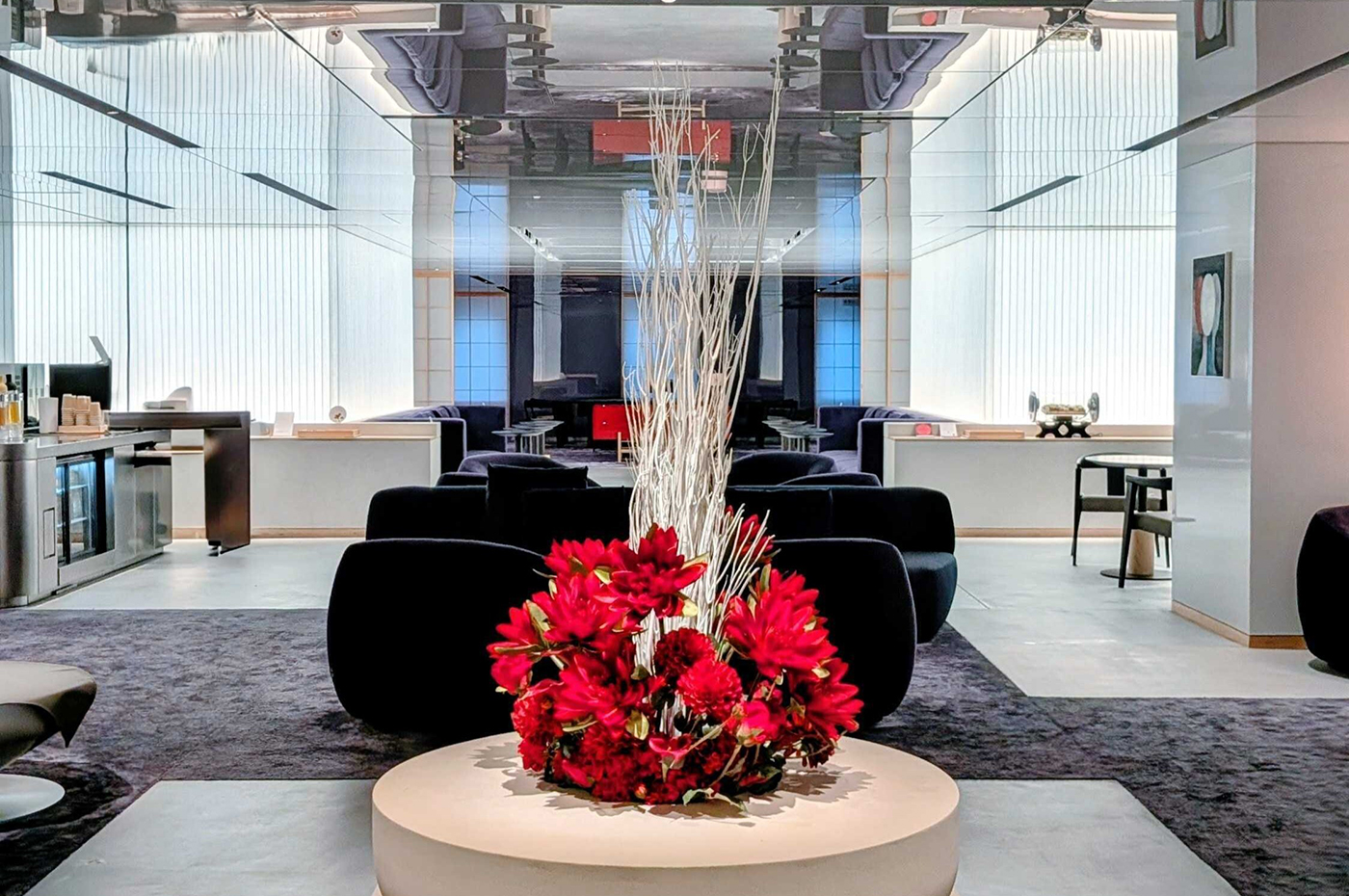 ラウンジのスタイリッシュな空間に調和するよう、ベースには重厚感のあるベージュのコンテナを使用。そこに、鮮烈で情熱的な「赤」のフラワーを贅沢に配し、コントラストを際立たせています。上部には、雪をまとった枝を思わせる「白」の枝物を大胆に挿すことで、ラウンジ全体の空間に視線の広がりと、凛とした季節感をもたらしました。